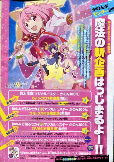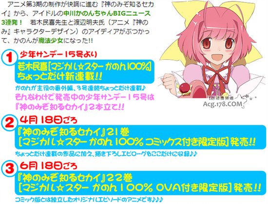 最后,预定6月18日发售的《只有神知道的世界》漫画单行本第22卷同样会发售限定版,同捆《魔法少女STAR花音100%》的OVA动画,并且OVA的内容与漫画版独立,是全新原创的剧情!在3月至6月这段期间,花音的FANS将享受到来自若木民喜的三重大礼!